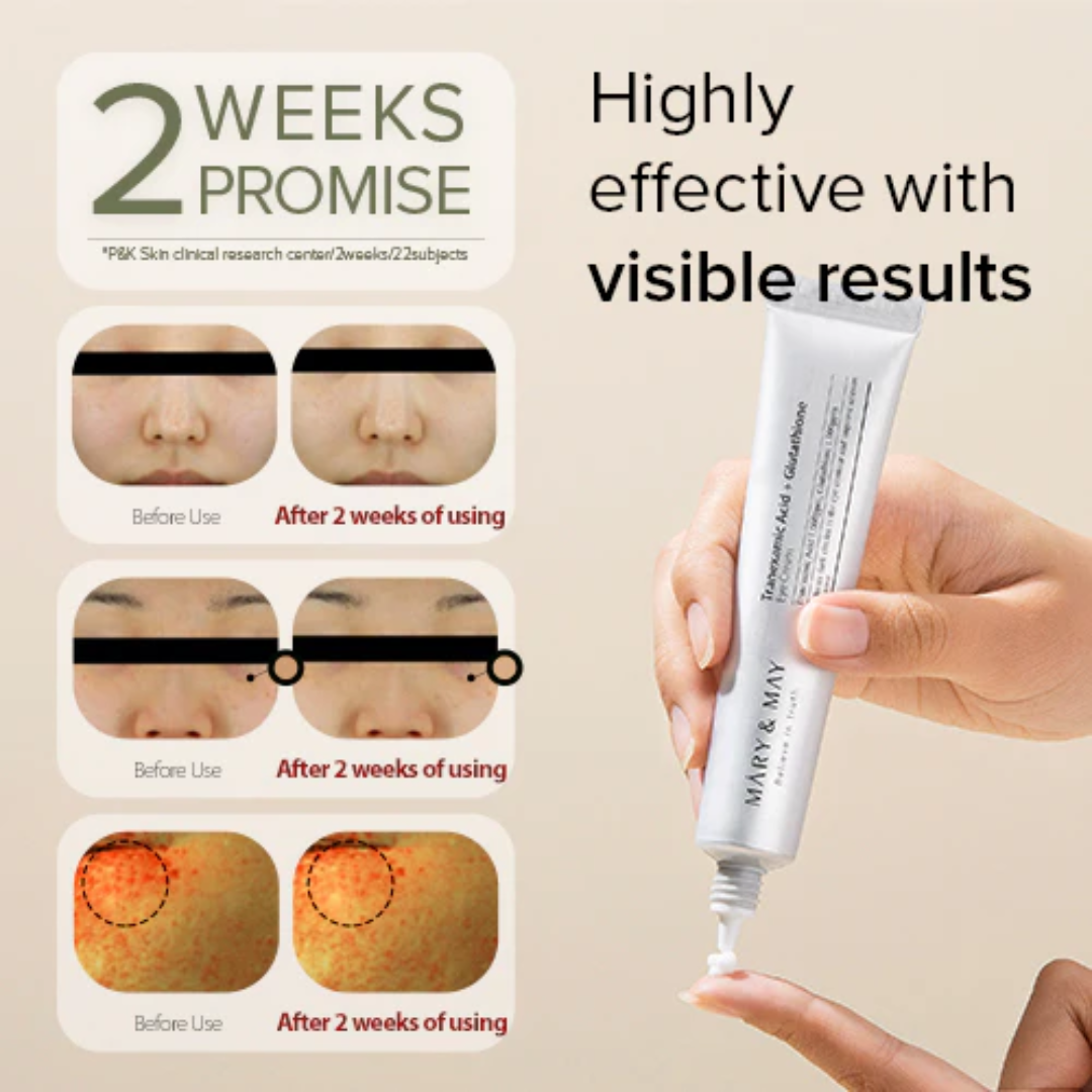 Revitalize tired-looking eyes and achieve a brighter, more youthful appearance with the Mary & May Tranexamic Acid + Glutathione Eye Cream. This powerful 2-in-1 functional eye cream is specially formulated with high concentrations of Tranexamic Acid (1,000 ppm) and Glutathione (1,000 ppm) to target stubborn dark circles, pigmentation, and fine lines around the delicate eye area.